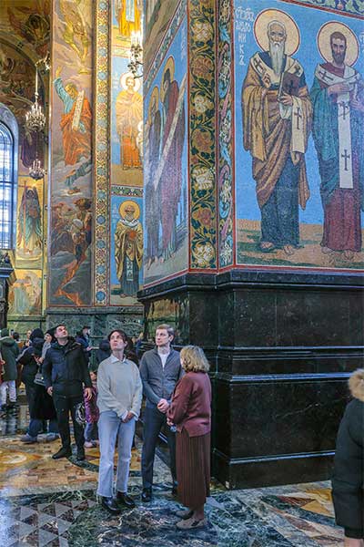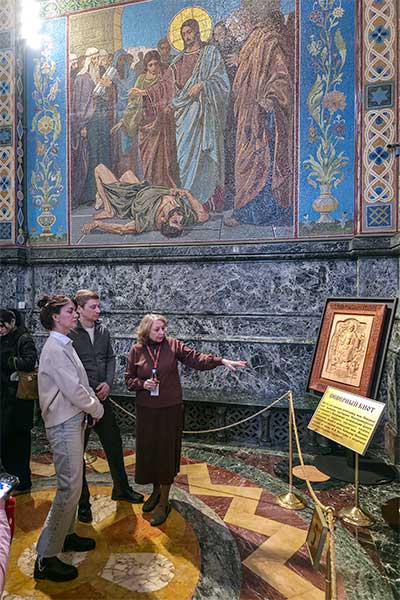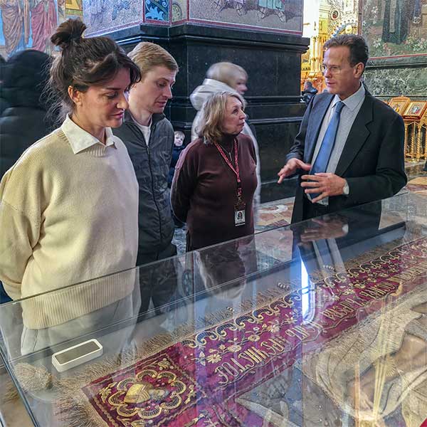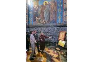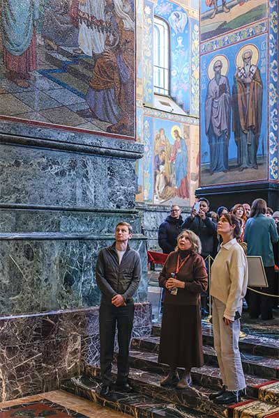 От имени директора музея Юрия Витальевича Мудрова гостей встретил начальник музеем-памятником «Спас на Крови» Илья Васильевич Демидов. Он подробно рассказал о ключевых направлениях музейной деятельности, включая научно-исследовательскую работу, реставрационные и выставочные проекты, образовательные программы, а также международное и региональное сотрудничество.