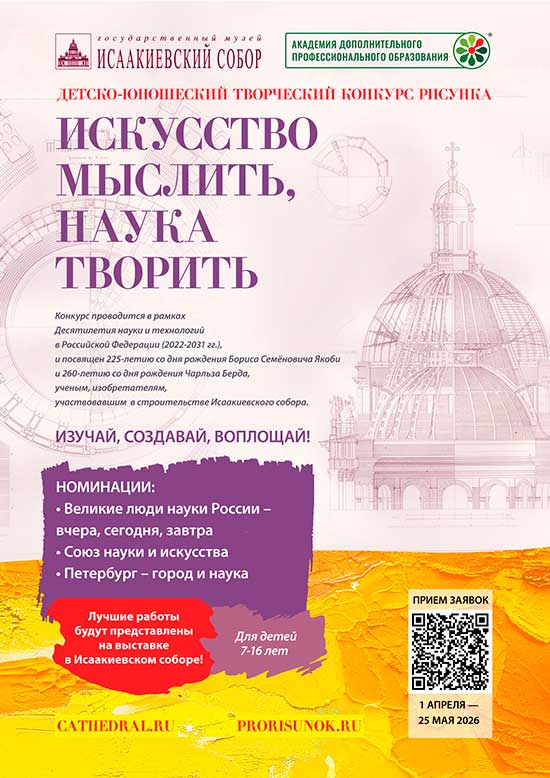 1 апреля стартует детско-юношеский творческий конкурс рисунка «Искусство мыслить, наука творить», посвященный 225-летию со дня рождения Бориса Семеновича Якоби и 260-летию со дня рождения Чарльза Берда, а также ученым и изобретателям, участвовавшим в строительстве Исаакиевского собора.