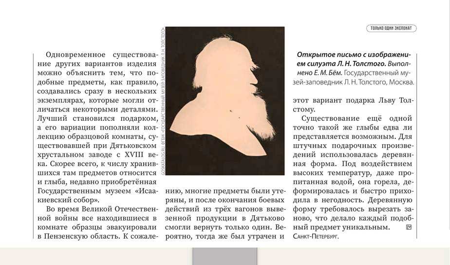 В февральском выпуске журнала «Мир музея» (№2 2026) вышла статья «Графское пресс-папье» заведующего сектором истории реставрации Государственного музея «Исаакиевский собор» Владимира Васильевича Жукова и специалиста экспозиционно-выставочного отдела фондов Оксаны Александровны Кизимовой. Посвящена она уникальному приобретению музея. Это «стеклянная глыба» (пресс-папье), созданная на Дятьковском хрустальном заводе по эскизу художницы Елизаветы Меркурьевны Бём (1843–1914) и подаренная Льву Николаевичу Толстому.