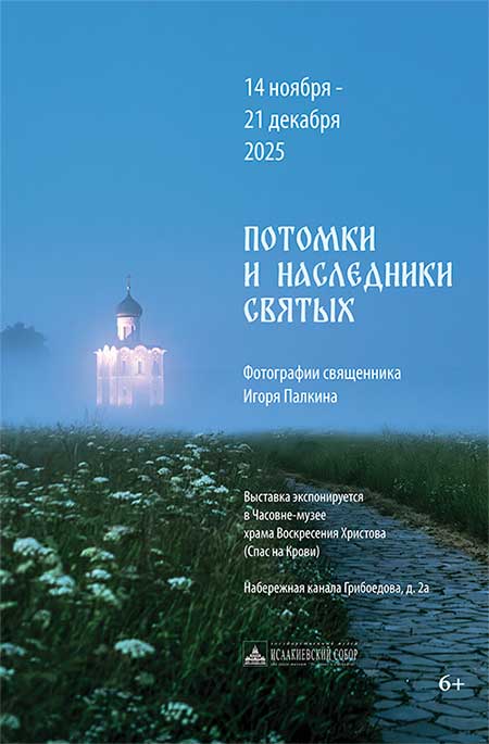 Государственный музей «Исаакиевский собор» представляет фотовыставку «Потомки и наследники святых». Экспозиция, в которую войдут около 60 фотографий, выполненных священником Игорем Палкиным, будет располагаться в выставочном зале Часовни-музея храма Воскресения Христова (Спас на Крови) с 14 ноября по 21 декабря. Этот проект предлагает уникальный авторский взгляд на современную Русскую православную церковь — изнутри, через призму объектива священника и профессионального фотографа.