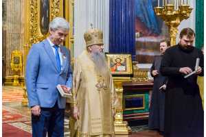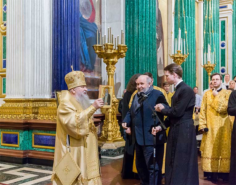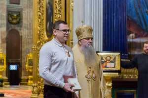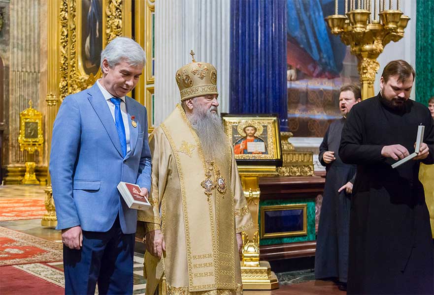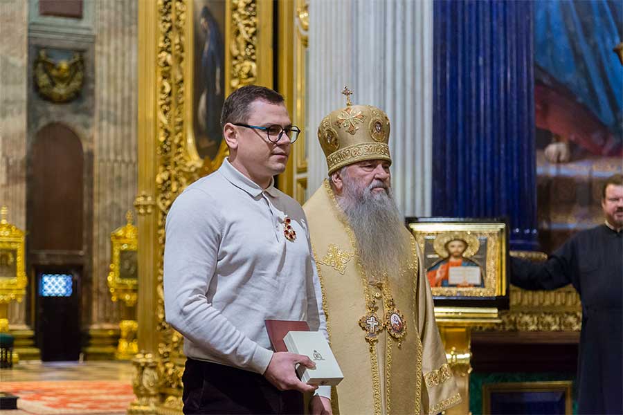 По окончании богослужения был отмечен вклад в сохранение культурного наследия благотворителя Владимира Евгеньевича Богданова, начальника отдела приема посетителей музея-памятника «Спас на Крови». Он был награжден церковным знаком «За добродетель» первой степени.