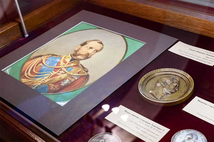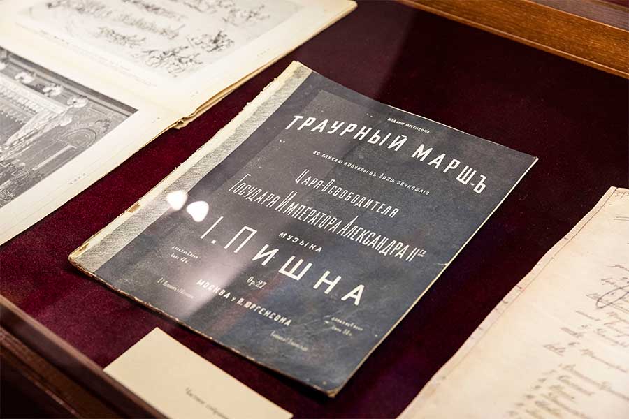 В экспозиции представлен посмертный образ Александра II, написанный художником К. Е. Маковским всего через несколько часов после трагедии, печатный экземпляр одного из вариантов траурного марша, сочиненного в первые дни после этих событий, и публикации в журнале «Нива», также имеющие мемориальное значение.