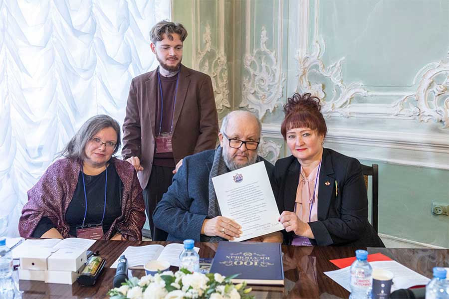О. В. Нестерцева зачитала обращение генерального директора Государственного музея-заповедника «Архангельское» В. Н. Задорожного и передала в дар один из первых переизданных экземпляров классической монографии С. В. Безсонова (1885–1955) «Архангельское. Подмосковная усадьба», отметив, что работа над переизданием велась коллективом музея в течение двух лет.