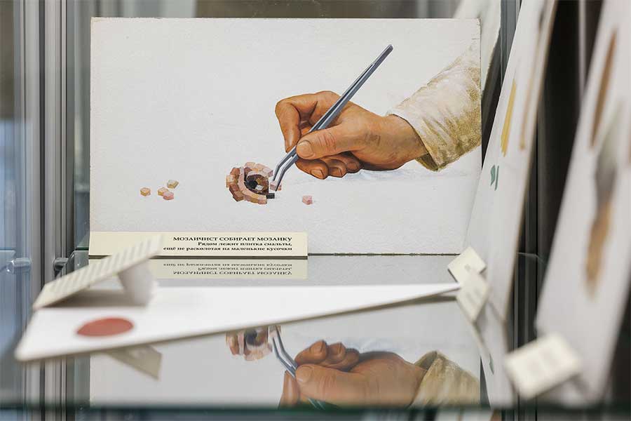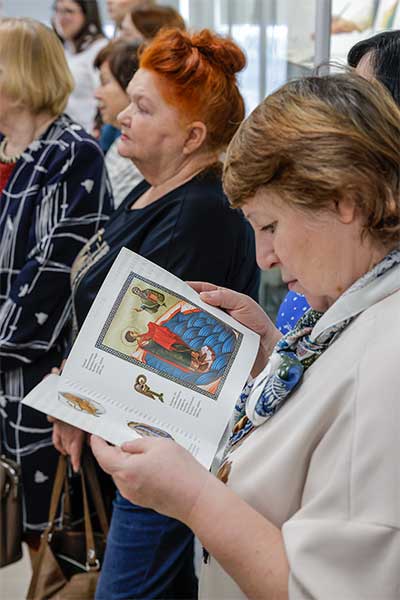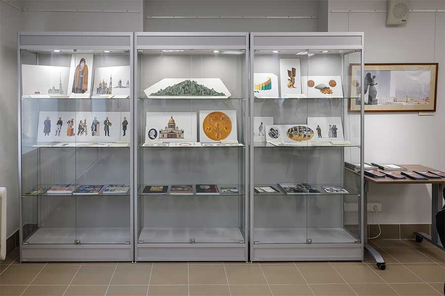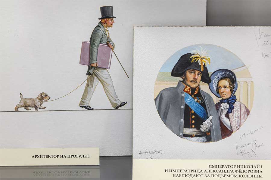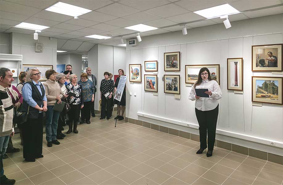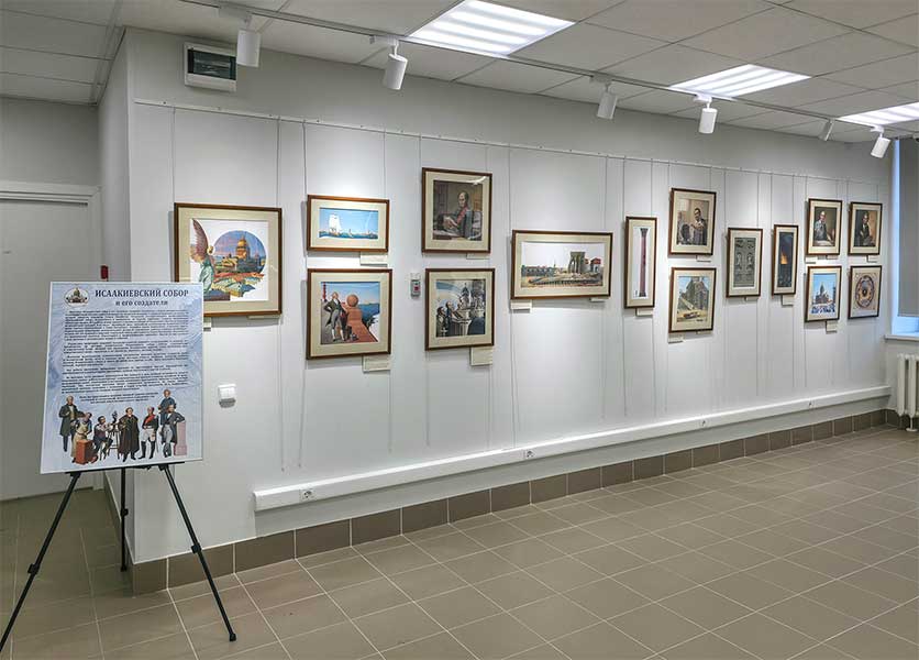После церемонии торжественного открытия Илья Васильевич провел подробную экскурсию по экспозиции. Он обратил внимание собравшихся на неслучайное сходство структуры выставки с книжным повествованием: работы здесь сгруппированы в тематические блоки, словно главы, рассказывающие историю — от внешнего вида предыдущих Исаакиевских церквей и этапов возведения ныне существующего собора до скульптуры в его убранстве, живописи и мозаики.