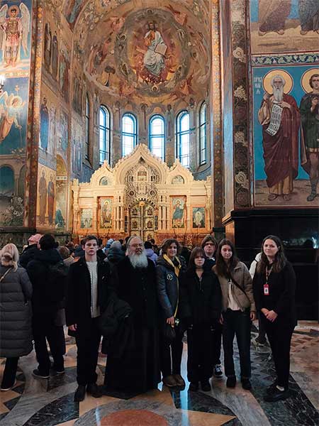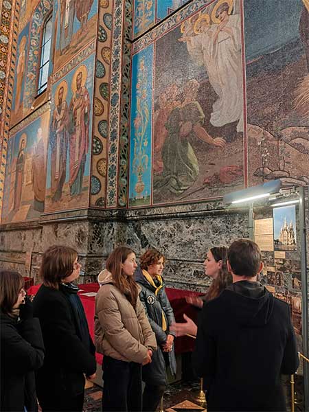 По возвращении в Санкт-Петербург программа дня продолжилась знакомством с историей храма Воскресения Христова, более известного как Спас на Крови – выдающегося памятника русского зодчества, поражающего воображение своим мозаичным убранством. Экскурсия позволила глубже понять замысел создания храма-мемориала на месте трагических событий.