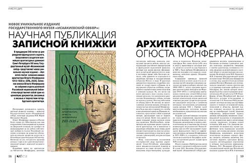 В октябрьском номере информационно-аналитического журнала «Вестник. «Зодчий. 21 век» 3 (96)/2025 вышла статья-интервью директора Государственного музея «Исаакиевский собор», почетного члена Российской академии художеств Юрия Витальевича Мудрова, подробно раскрывающая содержание книги «Non omnis moriar: записная книжка архитектора Огюста Монферрана». Эта небольшая по размеру рукопись, хранящаяся в Российской национальной библиотеке, является едва ли не единственным личным мемориальным предметом, сохранившимся после смерти создателя Исаакиевского собора. Книжка сопровождала Монферрана на протяжении десятилетий, со времен службы в наполеоновской армии вплоть до работы в России, и ее содержание многогранно: здесь и архитектурные эскизы, и списки книг из личной библиотеки, и записи конкурсных программ, и даже едва уловимый автопортрет.