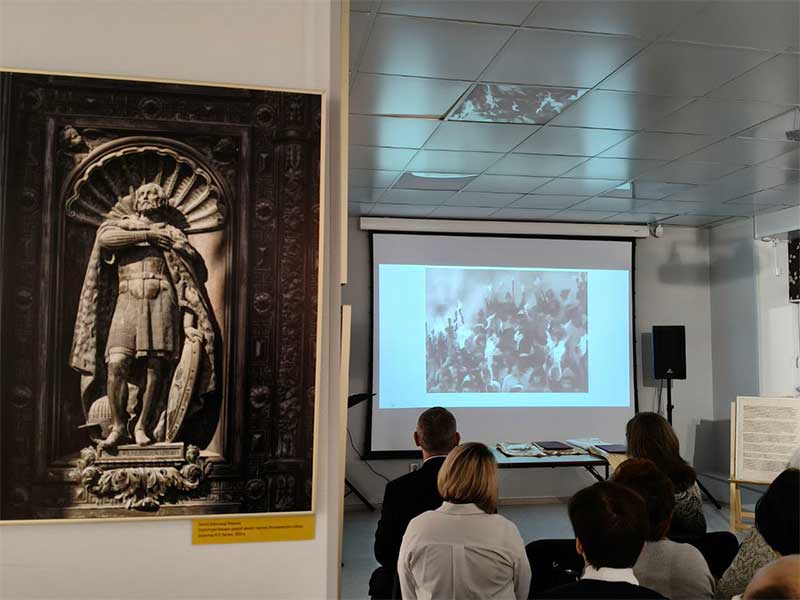 Рассказывая о проекте, она отметила, что в нем сошлось многое: и рассказ о жизни Александра Невского, и искусствоведческий анализ, и прослеживание изменений в его иконографии. Особое внимание она уделила уникальным фотографиям памятников, для создания которых фотографам приходилось использовать высотные конструкции, чтобы запечатлеть детали, невидимые с земли. В завершение Марина Евгеньевна передала книги, изданные Государственным музеем «Исаакиевский собор», в библиотеку Городского историко-краеведческого музея г. Полярного и отметила его активную работу с жителями города.
