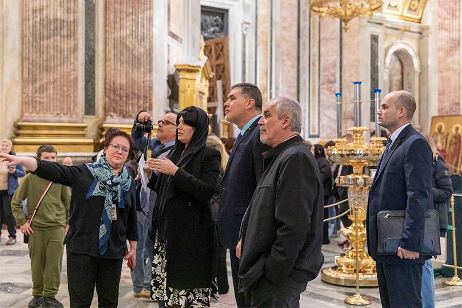Гости познакомились с двумя знаковыми объектами, важнейшими памятниками культурного и духовного наследия. В ходе экскурсии по Исаакиевскому собору участники делегации узнали об уникальной истории строительства одного из крупнейших купольных храмов. Особое внимание было уделено инженерным решениям, позволившим возвести это архитектурное сооружение, а также его богатейшему художественному убранству — мозаикам, живописи и скульптуре. Гости смогли оценить роль собора в культурной жизни Санкт-Петербурга и России, прочувствовать масштаб замысла архитектора и мастерство исполнителей.