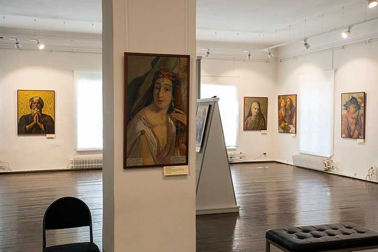 Небольшой фрагмент выставки – зарисовки, выполненные Николем Матвеевичем Синяковым, принимавшим участие в реставрации живописи Исаакиевского собора. На этих рисунках изображены портреты его коллег-реставраторов, а также нехитрый инвентарь, которым пользовались художники-реставраторы тех трудных послевоенных лет.