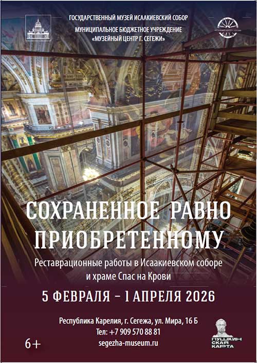 5 февраля в музейном центре города Сегежа (Республика Карелия) откроется выставка «Сохраненное равно приобретенному...». Она расскажет об одном из важнейших направлений деятельности Государственного музея «Исаакиевский собор» — систематической работе по сохранению уникального декоративно-художественного убранства храмов-памятников, входящих в его состав.