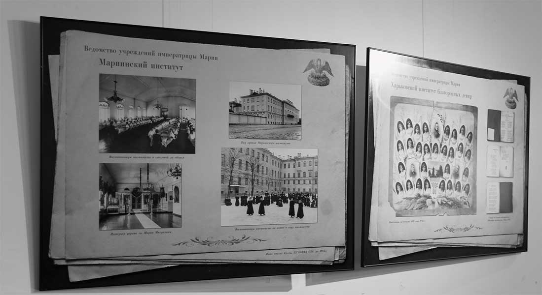 На выставке представлены фотографии документов и указов, копия Присяги Сердобольных вдов, росписи жалований, меню, стихи к юбилеям, интерьеры заведений (классы и мастерские, дортуары и столовые, прачечные и сушильни, аптеки и операционные, палаты для новорожденных и подкидышей и пр.), портреты обитателей – воспитанников и воспитанниц, служителей, нянек и начальствующих лиц.