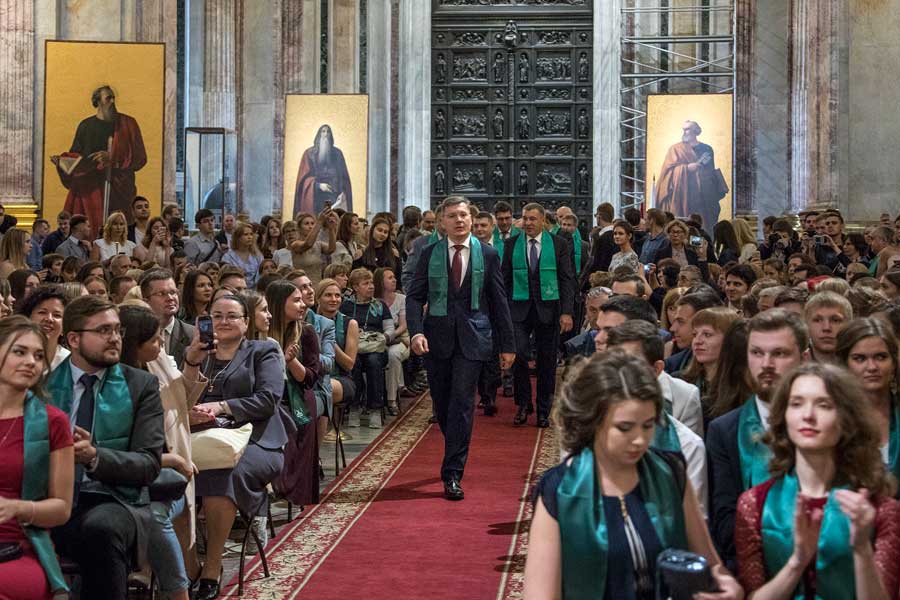 Под сводами Исаакиевского собора собрались выдающиеся деятели транспортной отрасли и представители администрации Санкт-Петербурга. Торжественную церемонию выпуска молодых специалистов открыл вице-губернатор Санкт-Петербурга Игорь Николаевич Албин.