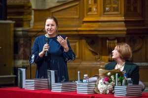 Ю. В. Мудров вручил памятную медаль, посвященную С. В. Ямщикову, представителю издательства Анне в благодарность за большую работу, проделанную при создании этой книги.