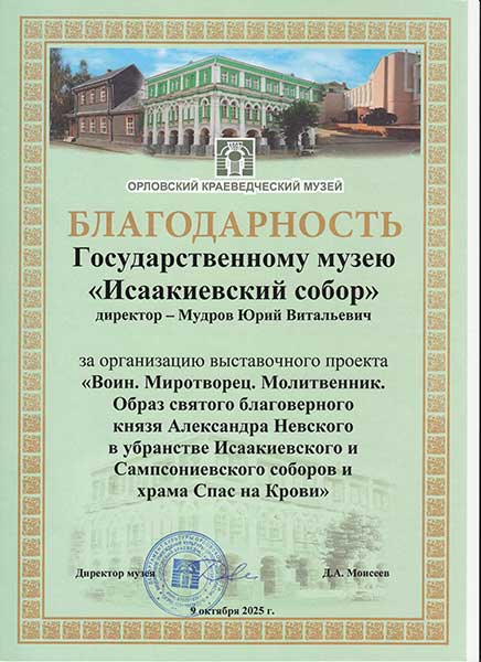 9 октября в Орловском краеведческом музее состоялось торжественное открытие выставки «Воин. Миротворец. Молитвенник. Образ святого благоверного князя Александра Невского в убранстве Исаакиевского и Сампсониевского соборов и храма Спас на Крови».