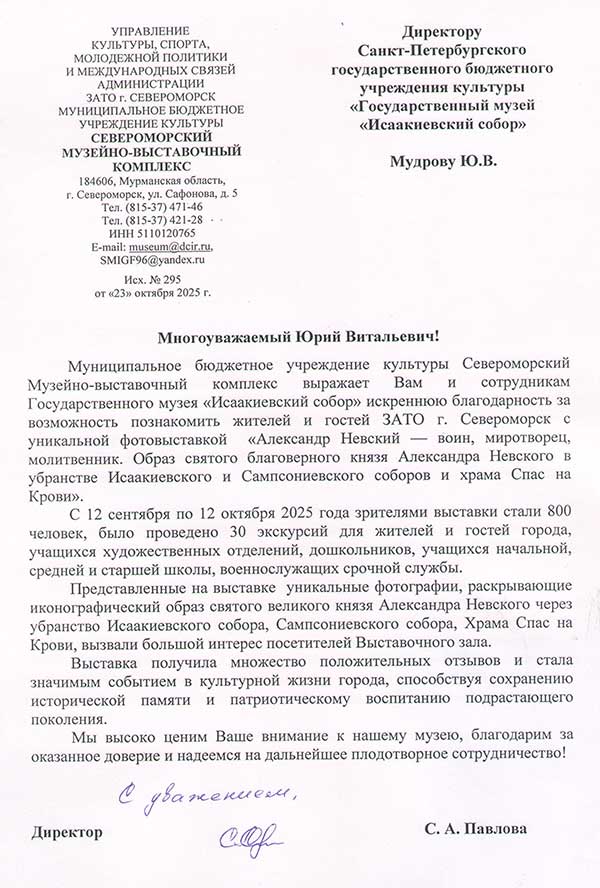12 сентября, в день празднования перенесения мощей святого благоверного князя Александра Невского, в Североморском музейно-выставочном комплексе состоялось торжественное открытие выставки «Воин. Миротворец. Молитвенник. Образ святого благоверного князя Александра Невского в убранстве Исаакиевского и Сампсониевского соборов и храма Спас на Крови».