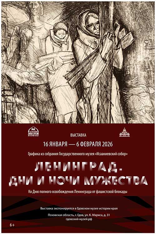 С 16 января по 6 февраля в городе Гдове Псковской области Государственный музей «Исаакиевский собор» представит выставку «Ленинград. Дни и ночи мужества». Экспозиция, в которую войдут изображения графических работ из фондов музея, будет располагаться в Гдовском музее истории края.