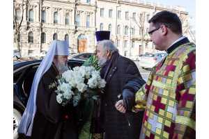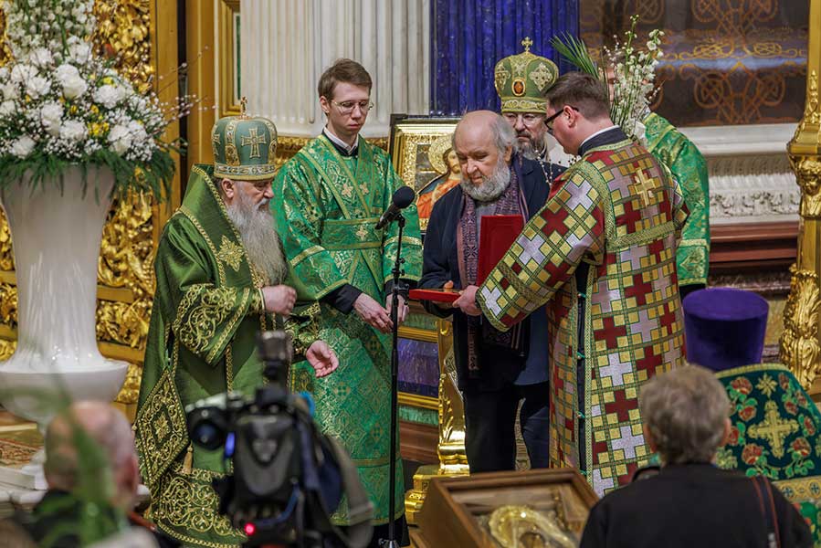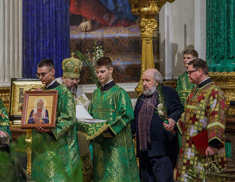 Среди молящихся присутствовал директор музея «Исаакиевский собор» Юрий Витальевич Мудров. Он преподнес владыке Варсонофию икону блаженной Матроны Московской. Ответным подарком стала книга «По стопам святого патриарха Тихона», изданная Казанским собором, а также икона «Благовещение».