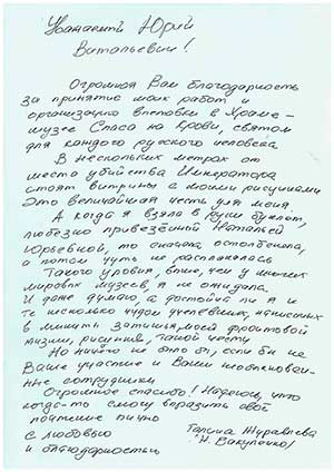 Далее выступила Наталья Юрьевна Воропаева. Она поблагодарила Юрия Витальевича и сотрудников петербургского музея за совместную работу по подготовке и проведению выставки. «Автор представленных работ мечтала побывать в Санкт-Петербурге и прикоснуться к стенам Спаса на Крови, но никак не могла предположить, что спустя небольшой период времени ее персональная выставка будет проходить именно в этом музее-памятнике», подытожила Н. Ю. Воропаева.