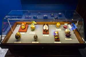 Представлены предметы из эмали, слоновой кости, перламутра, а также пасхальные яйца.
