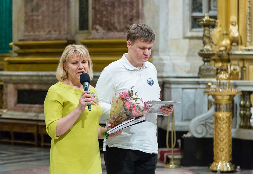 - школе-интернату № 1 имени К. К. Грота – Таисии Кравченко, Вадиму Крикуненко и их руководителю Светлане Александровне Манилкиной, заведующей музеем ГБОУ школы-интерната № 1 имени К. К. Грота. Светлана Александровна присоединилась к высказанным ранее словам признательности, особо отметив значимость инклюзивного подхода в организации работы, а также поблагодарила за возможность принимать участие в разных мероприятиях по государственной программе «Доступная среда» в Государственном музее «Исаакиевский собор».