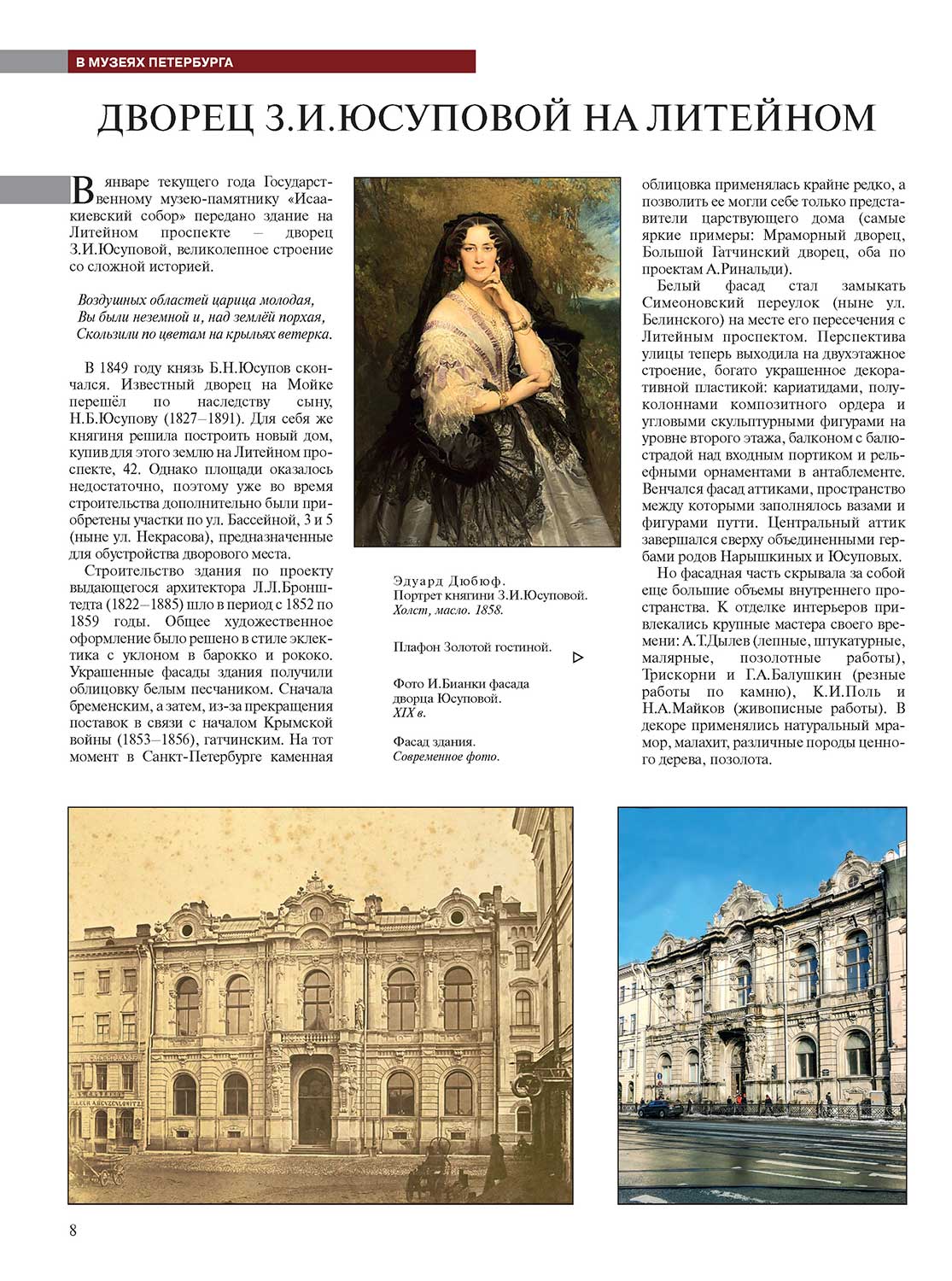 Читатели журнала имеют возможность погрузиться в уникальную историю здания на Литейном проспекте — дворца Зинаиды Ивановны Юсуповой, узнать о сложной судьбе великолепного сооружения и его существовании на протяжении нескольких столетий, подробно познакомиться с богатым убранством.