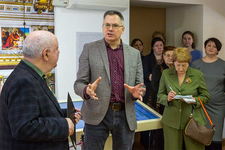 Перед гостями выступил директор Государственного музея-памятника «Исаакиевский собор» Ю. В. Мудров. Юрий Витальевич упомянул о трудоемком процессе создания Исаакиевского собора — его проектировании, строительстве и художественном оформлении. Вспомнил исторические события, при которых собор не только выстоял, но и стал одним из центров духовной и культурной жизни города и страны в целом. Директор поделился с участниками мероприятия сообщением о деятельности, связанной с сохранением культурно-исторического наследия и популяризацией имен строителей, архитекторов, художников, внесших значительный вклад в историю нашего Отечества. «В 2018 году в Париже, на кладбище Монмартр, силами Государственного музея-памятника «Исаакиевский собор» была установлена мемориальная плита из рускеальского мрамора на могиле зодчего Огюста Рикара Монферрана. Ранее имя архитектора не значилось на памятнике, который был поставлен любящим сыном на могиле матери, ставшей позднее местом и его упокоения», — добавил Ю. В. Мудров. В конце своего выступления Юрий Витальевич поблагодарил всех присутствующих и организаторов выставки, а также передал в фонды Национального музея Республики Карелия памятную медаль, выпущенную к 200-летию начала строительства Исаакиевского собора. Пожелал дальнейших творческих успехов, здоровья и счастья.