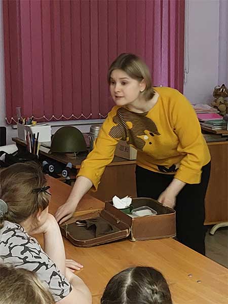 Кусочек блокадного хлеба, коптилка, письмо-треугольник с фронта, блокадные карточки — эти воссозданные вещи можно было достать из «тревожного» чемоданчика». А маленький ящик с буквами «ПДМ» рассказал о том, как происходила упаковка музейных ценностей для эвакуации в тыл.