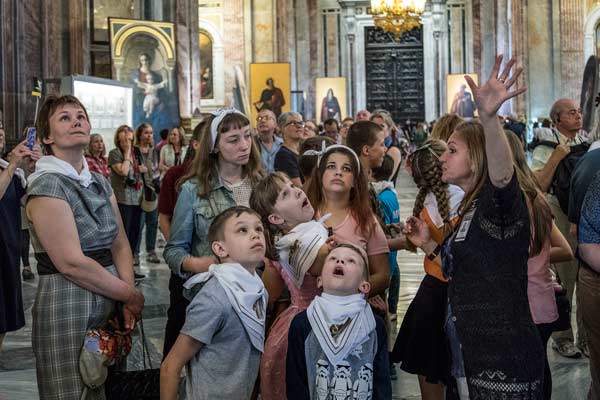 Сотрудники музея рассказали детям о том, какие технологии использовались при строительстве собора, почему стены храма было решено украсить мозаичными изображениями, как происходил опасный процесс огневого золочения куполов. Школьники узнали о важной роли Исаакиевского собора в сохранении культурных и исторических ценностей во время Великой Отечественной войны и о специалистах Объединенного хозяйства музеев, спасавших музейные коллекции. Сотрудник музея, петербургский иконописец Георги Панайотов рассказал детям об основных принципах реставрации, показал и объяснил, как укрепляется живописный слой монументальной живописи на примере текущих реставрационных работ в музее.