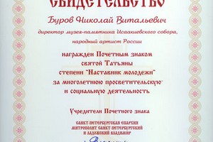 В Исаакиевском соборе состоялась церемония награждения победителей Межвузовского конкурса почетными знаками святой Татьяны. В номинации «Наставник молодежи» знаком святой Татианы был награжден директор Государственного музея-памятника «Исаакиевский собор» Николай Витальевич Буров.
