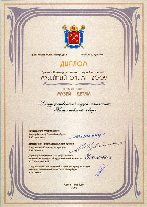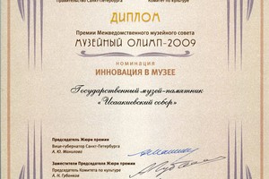Администрацией Санкт-Петербурга учреждена первая премия Межведомственного музейного совета «Музейный Олимп». Эта высшая профессиональная награда присуждается за выдающийся вклад в развитие музеев и музейного дела в Санкт-Петербурге. Премия «Музейный Олимп» присуждается в пяти номинациях: «Музей года», «Экспозиция года», «Музейная книга», «Музей – детям» и «Инновация в музее». В 2009 году в пяти номинациях конкурса приняли участие 35 музеев.