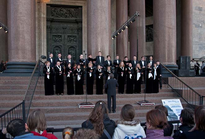 В "Ночь музеев" состоялось выступление Камерного хора Смольного собора и Государственного симфонического оркестра «Классика» у колонн Исаакиевского собора.