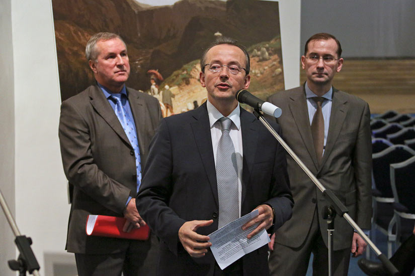 Представил выставку российской публике директор Французского Института в Санкт-Петербурге Мишель Гранж. На открытии выступили Р.Шапталь, представитель Генерального Совета Пюи-де-Дом, А.В.Квятковский, заместитель директора музея по научной работе, курирующий российско-французские проекты музея, а также С.Сегэн, автор фотографий, и С.В.Кривонвенчиков, научный сотрудник Государственного Русского музея и хранитель картины К.А.Савицкого «Путешественники в Оверни». Любезно предоставленная Русским музеем цифровая копия этого полотна позволила посетителям выставки увидеть природу департамента Пюи-де-Дом такой, какой она представала перед русскими художниками XIX в.