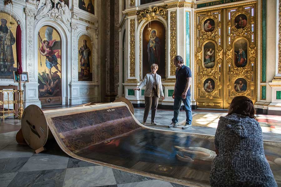 В рамках подготовки межмузейной выставки, посвященной 200-летию начала строительства IV Исаакиевского собора, сотрудниками музея совместно с художниками-реставраторами был осуществлен осмотр хранящихся в фондах музея живописных полотен, раскатанных с валов и требующих проведения реставрационных работ для дальнейшего экспонирования.