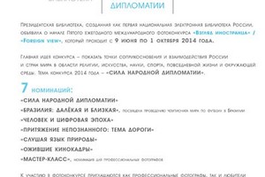 Президентская библиотека объявляет о начале Пятого ежегодного международного фотоконкурса «Взгляд иностранца» / «Foreign view», который будет проходить с 9 июня по 1 октября 2014 года. Он объединит фотографии, сделанные жителями других стран в России, и фотографии, сделанные россиянами за рубежом.