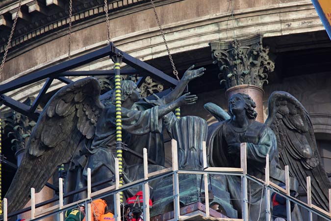 На юго-западный угол Исаакиевского собора вернулась скульптурная группа "Ангелы со светильником" работы И.П.Витали, находившаяся в реставрации более четырех лет.